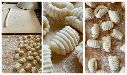 Gnocchi is a pasta made up of egg, potatoes, and flour. They are small pieces of pasta that's the size of a thumb. It's made by boiling the potatoes and rolling the dough into little "snakes" like the struffoli is. Then cutting it into thumb tip sizes to throw into a pot to boil.